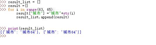 [{'城市':'城市63'},{'城市':'城市64'}],但是实际结果却是[{'城市':'城市64'},{'城市':'城市64'}]。原因:python中的对象就像c语言里一个指向一块内存地址的指针。可以用id(result)查看字典result的唯一标识,可以类比成result在内存中的地址。