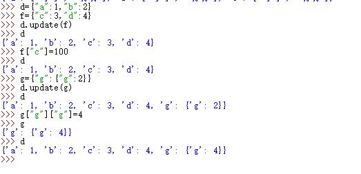 可以看到字典d会拷贝第一层变量的值,例如字典d中的值不会和字典f有关系。而字典g的值得变化会影响字典d的值。