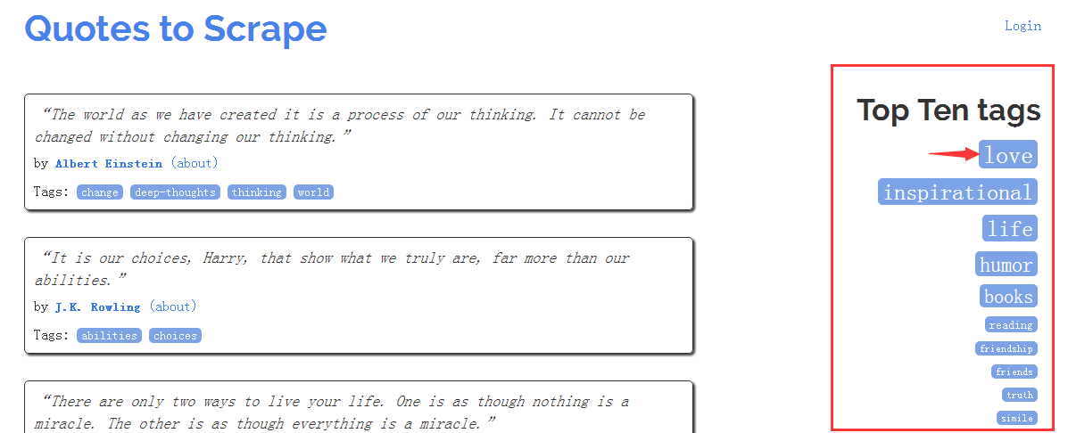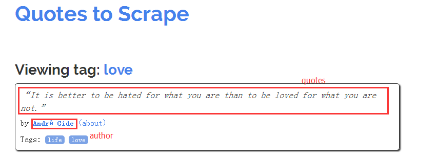 http://quotes.toscrape.com/tag/love/page/1/如果我们按照上面的page页数来爬数据,那我们的数据就是重复,这个问题我们需要在下面进一步解决。